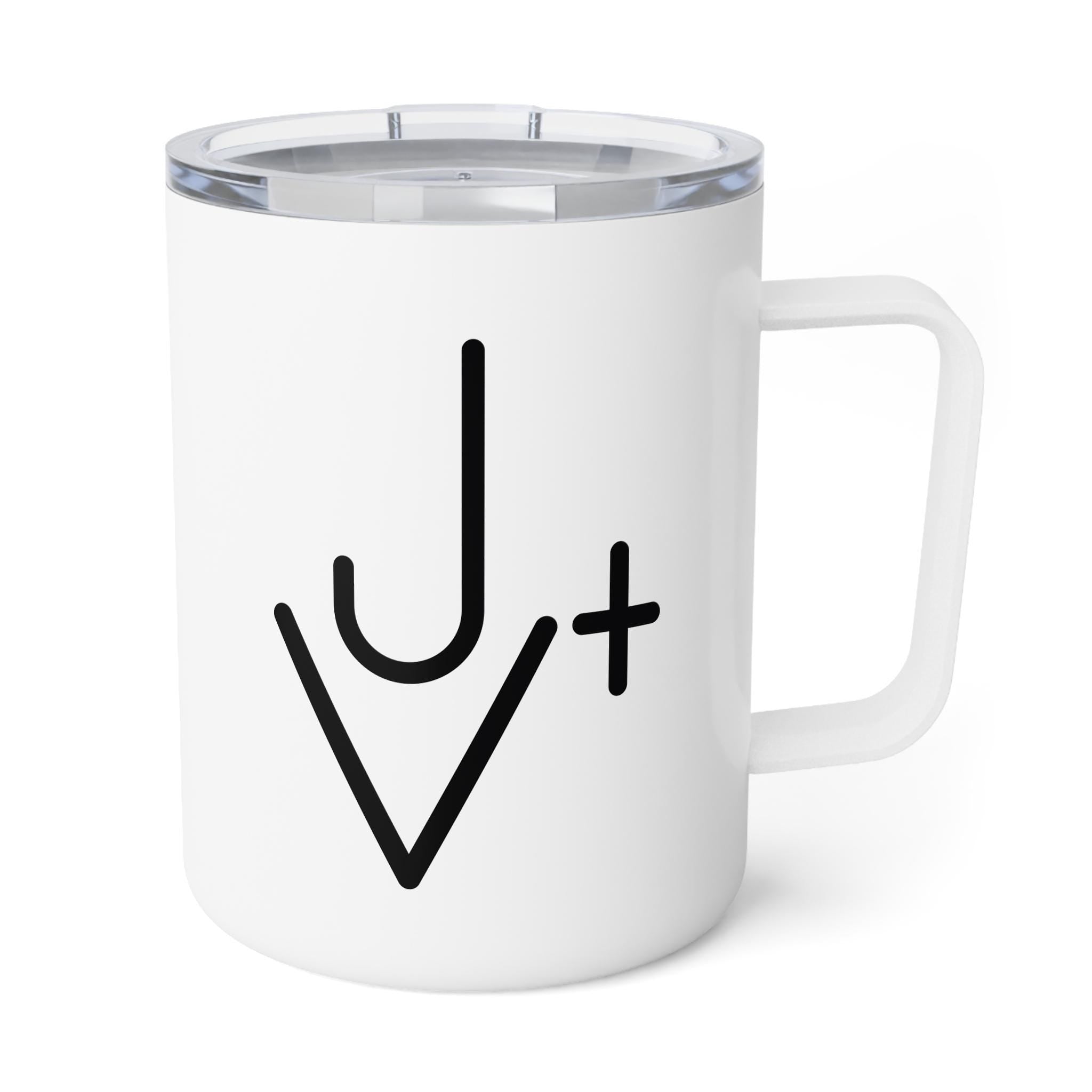 A sleek 10oz insulated coffee mug designed for mornings when clarity matters. The double-wall stainless steel construction holds temperature and keeps hands comfortable, while the clear push-on acrylic lid lets you sip without the guesswork. The glossy, full-wrap finish carries a simple, hand-drawn motif in stark black on a clean white field — minimal and quietly expressive. Lightweight and durable, it slips into a bag or perches on a desk without fuss. Safe and easy to clean, this mug blends everyday practicality with an understated, modern look that suits slow mornings, quick commutes, and cozy desk sessions.