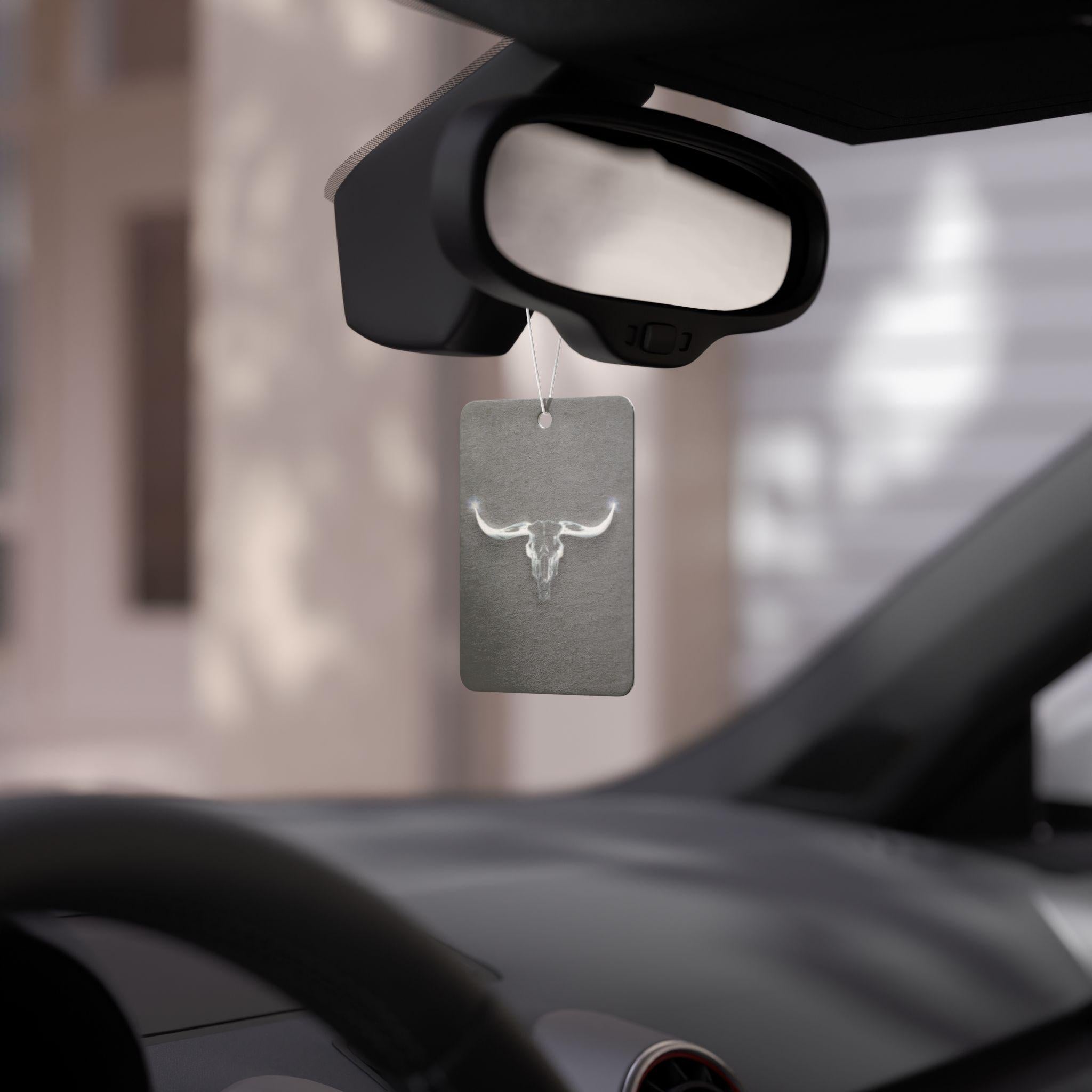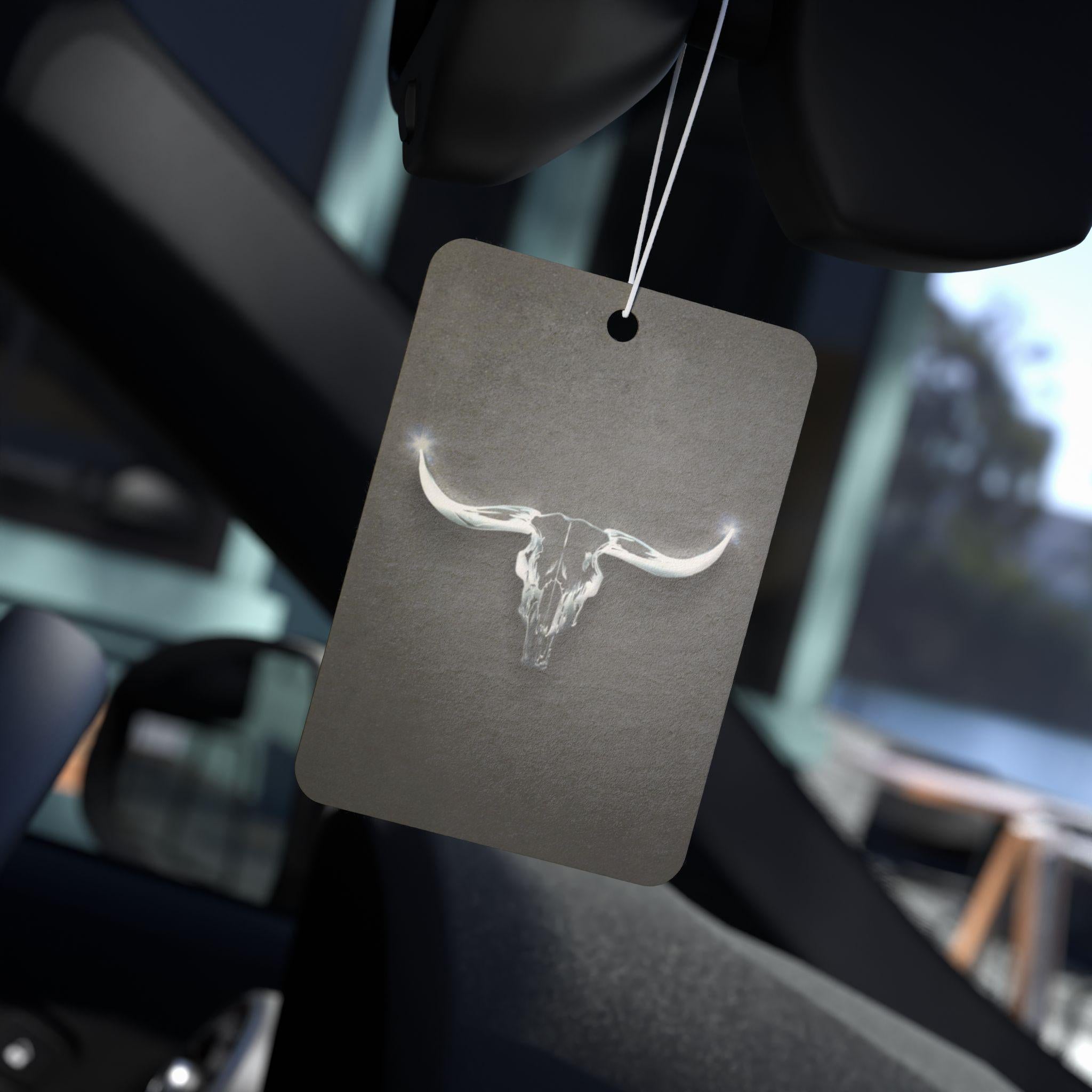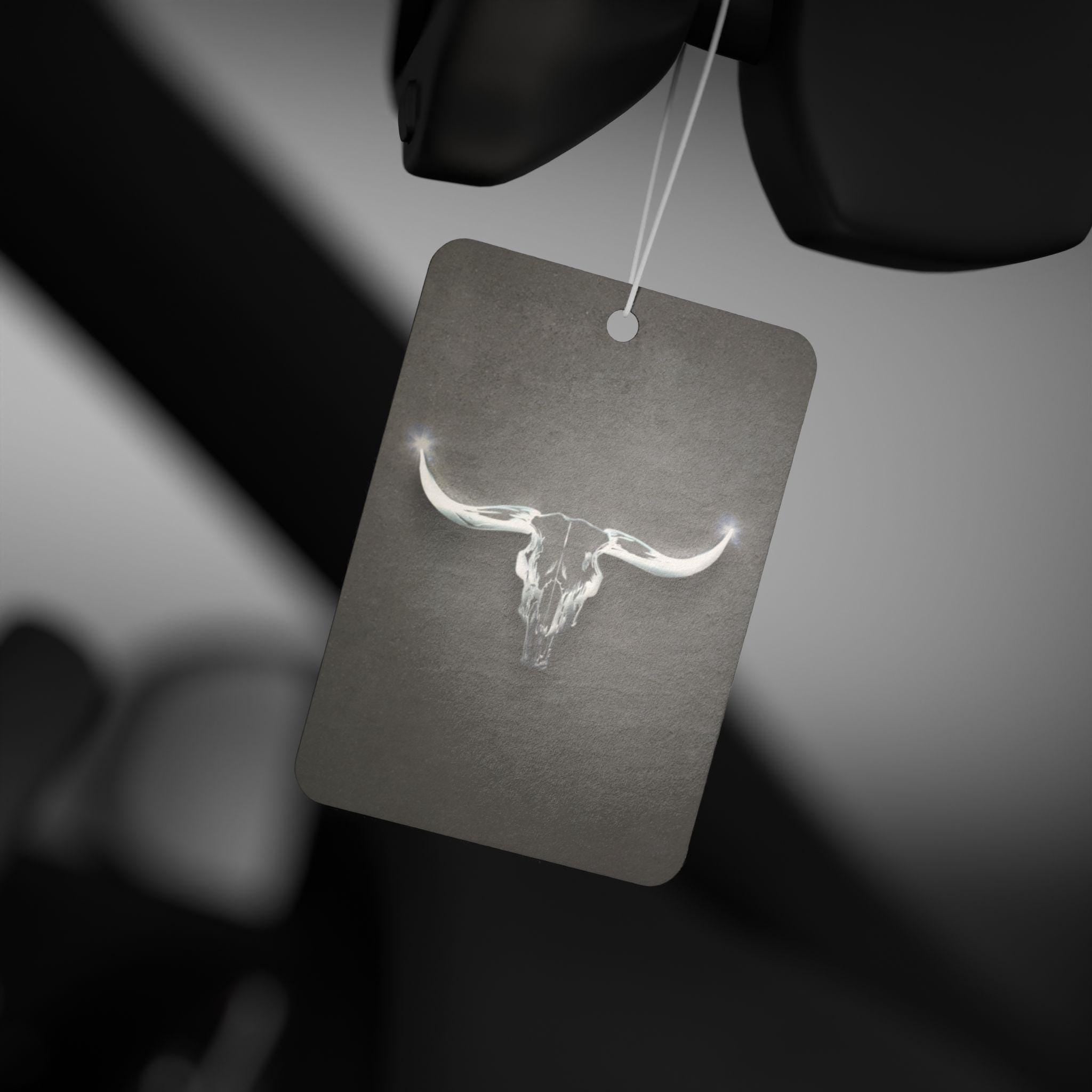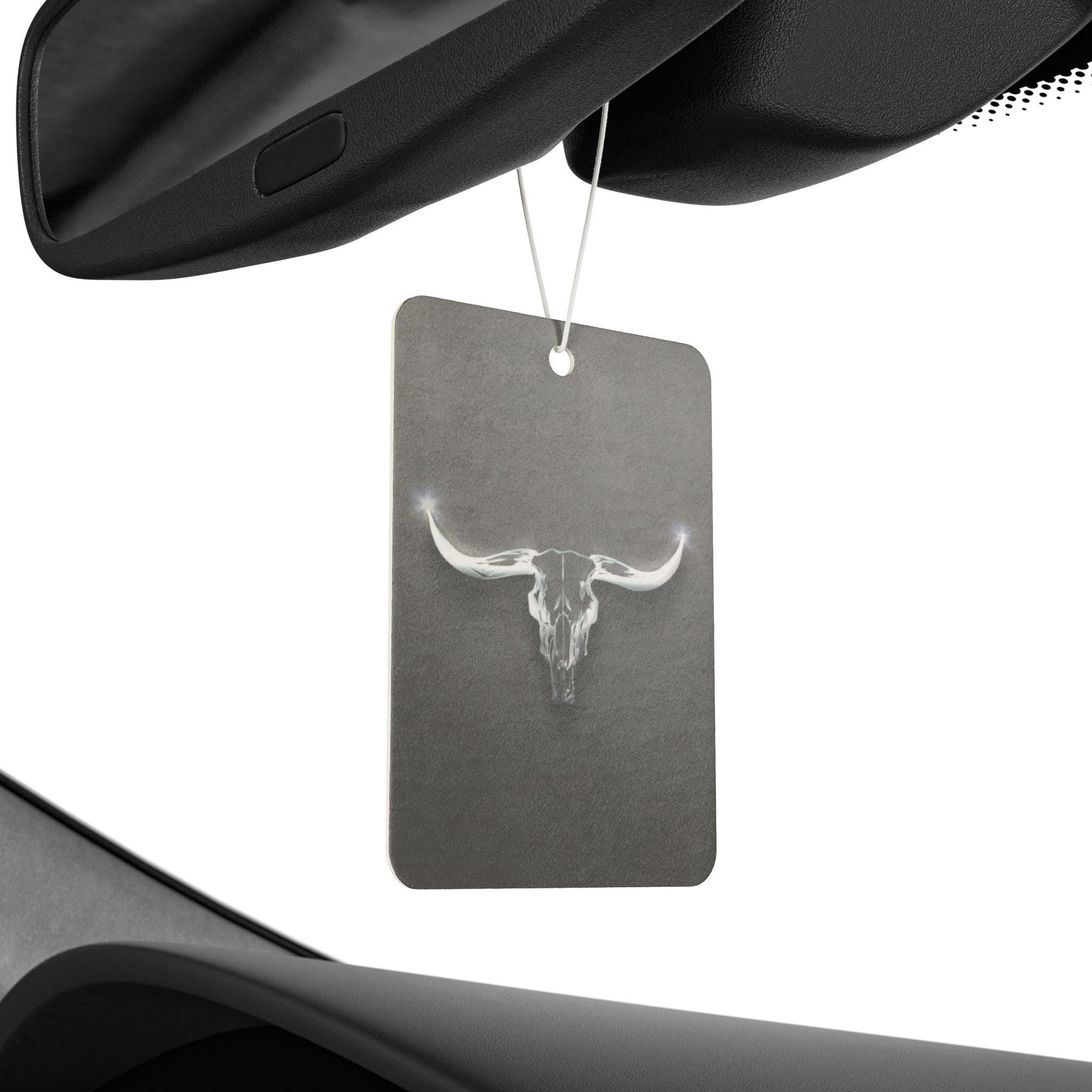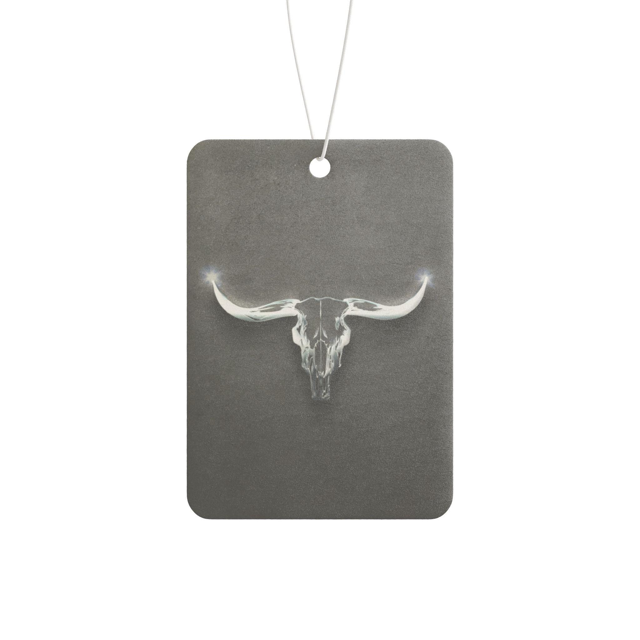 Bring a quiet, rugged calm into your vehicle with this charcoal-hued air freshener. A soft, ghostly longhorn skull floats at the center, giving the piece a minimalist, western edge without shouting. Each board is printed on both sides so the subtle artwork reads the same no matter where it hangs. Choose from three distinct scents — the crisp, aromatic Pine that feels like a walk through fir trees; a Leather-tinged New Car blend with green and apple top notes; or the cool, citrus-tinged Black Ice — to set the mood for road trips, slow drives through open country, or daily commutes that could use a little atmosphere. Lightweight and understated, it layers scent and style in a way that complements rustic, vintage, and modern-cowboy interiors.