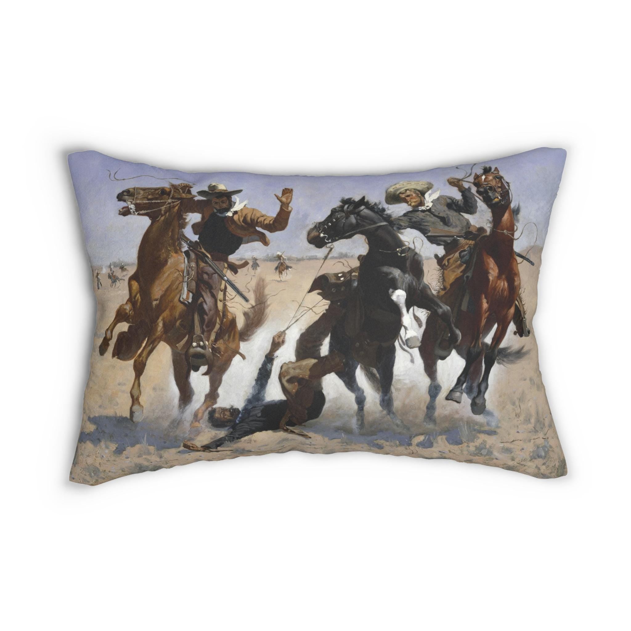 Transform your space with this stunning lumbar pillow, featuring a vibrant and dynamic design that captures the spirit of adventure and the wild frontier. Perfectly blending style and comfort, this pillow adds a touch of elegance to your home decor while providing exceptional support for your back. Ideal for those who appreciate art and history, it serves as a conversation starter in any room.