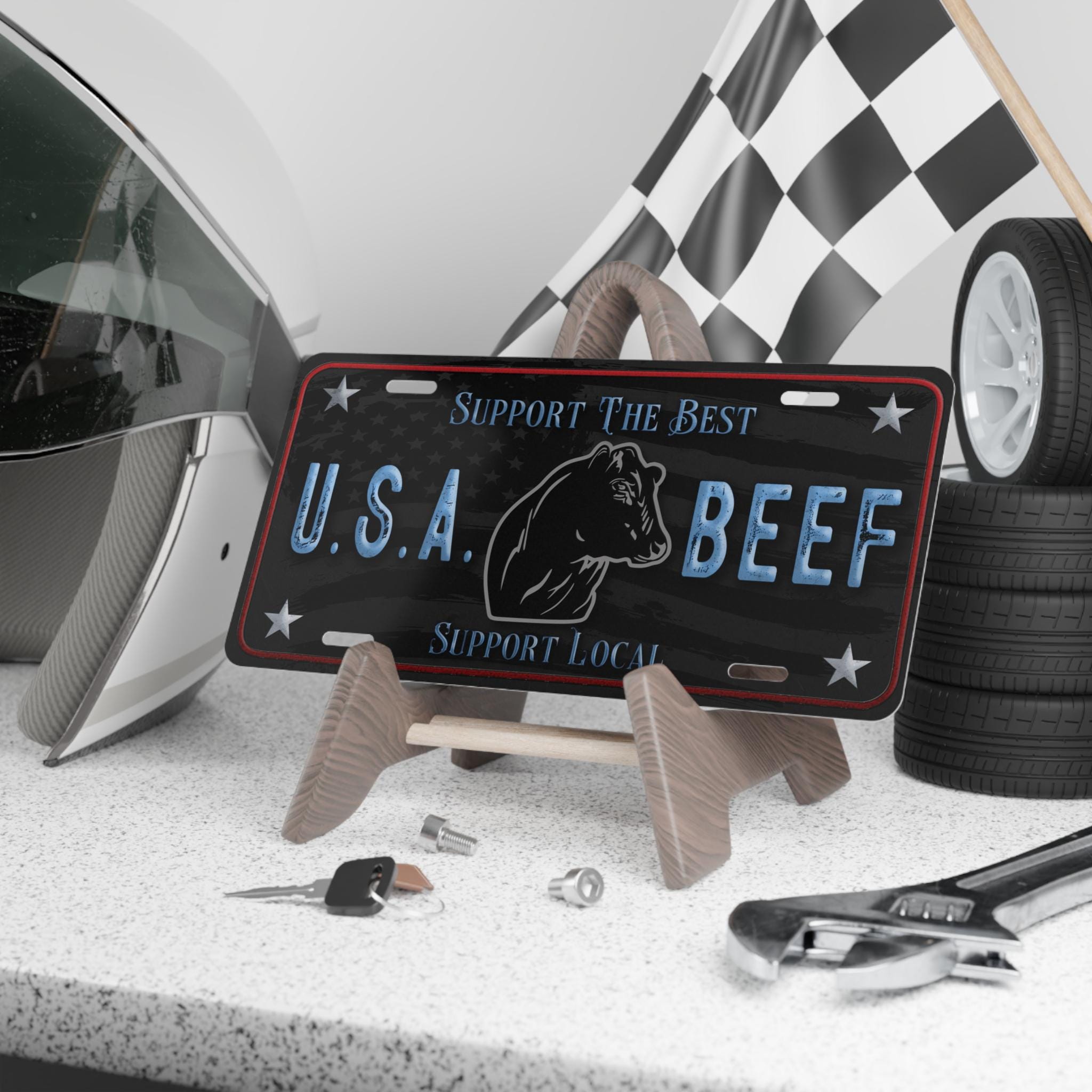 Show off your pride of USA and of local beef with this unique personalized plate. Each plate is 100% made with robust aluminum material and comes with pre-drilled holes for hassle-free installation. Measuring in at 12" x 6", it is the perfect size to decorate any vehicle or wall as a stylish statement piece.